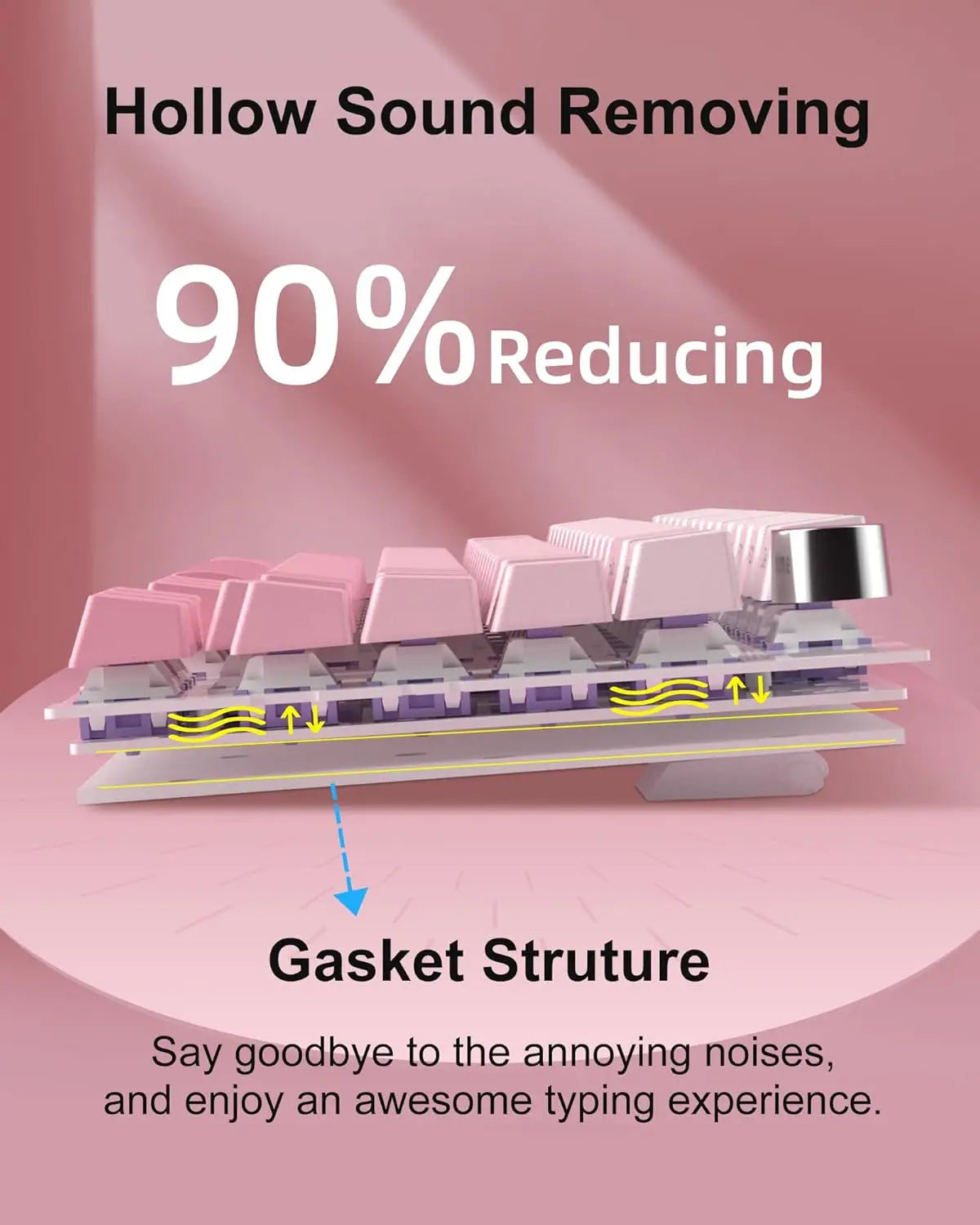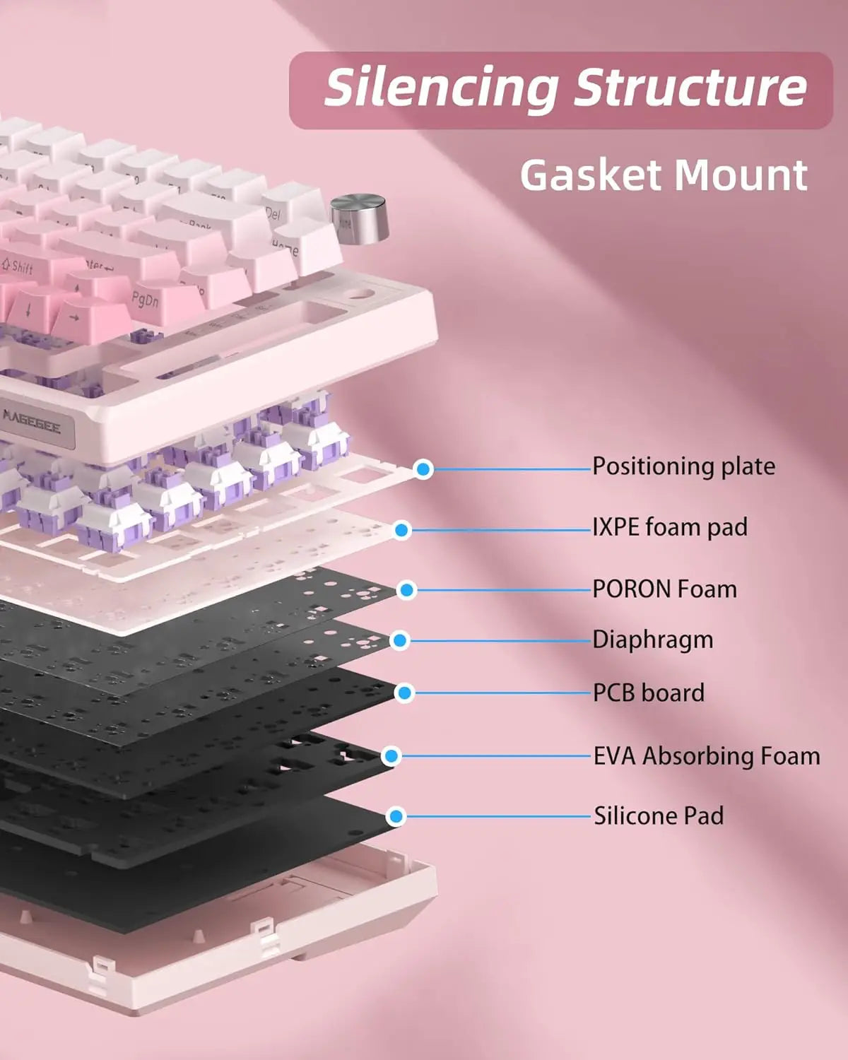 5-LAYER SOUND ABSORBING FILLING: In order to improve the noise situation, this gasket keyboard is equipped with a IXPE foam pad, PORON foam, diaphragm, EVA soundproofing foam and silicone absorbing pad in the gaps between the positioning plate, PCB board and bottom. This greatly reduces the resonance space inside the keyboard, thereby suppressing hollow sounds and making every key press comfortable and pleasant. For gamers and office users, this keyboard is a great addition to the desktop.