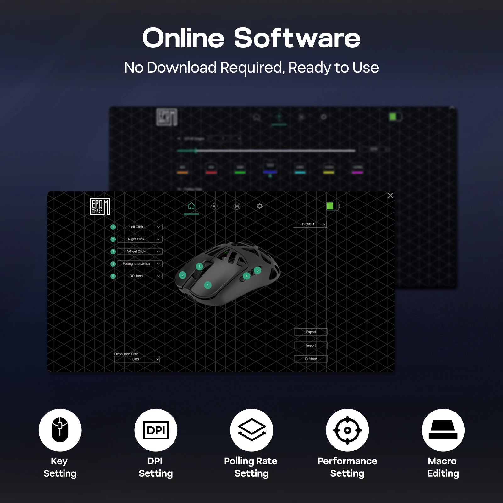 Through our convenient online software, you can easily access its features without downloading an app. The mouse is equipped with four programmable buttons (the left mouse button cannot be customized), allowing you to tailor your gaming experience to your personal needs. You can set up macros and shortcuts to optimize operations, enhance gaming efficiency, and gain a tactical advantage during battles. This design aims to improve the overall gaming experience, making each of your gaming sessions smoother and more flexible.
